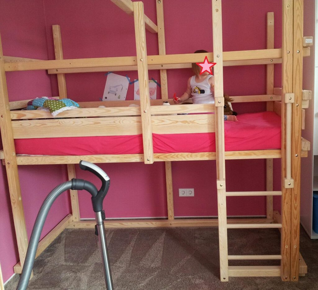 Tochterkind hat seit dem 1. Geburtstag ein 5 stufiges Hochbett – ich finde es auch immer noch praktisch. Nur dann nicht, wenn man (= ich) es neu beziehen muss. Auf dem Foto ist es in der 3. Aufbaustufe zu sehen.