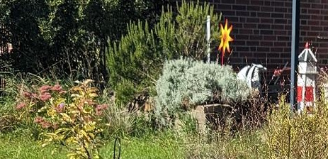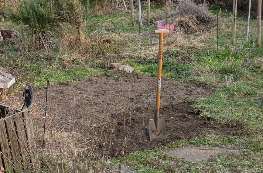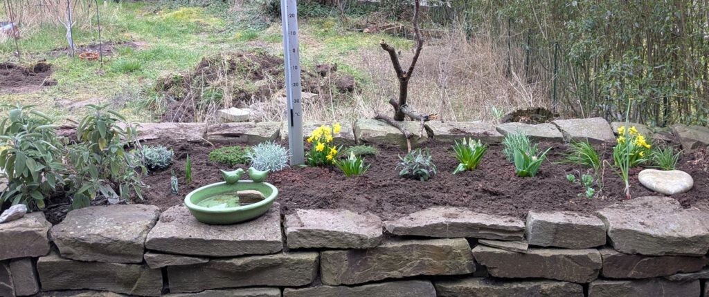 die Wüste im Hintergrund wird erst mal bleiben – bis die alten Rasenstücke über die Biotonne entsorgt sind, wird es sicher 4-5 Monate dauern. Nur das Stück direkt vor dem Beet wo das Totholz steht, werde ich noch mal von Gras befreien, allerdings nichts pflanzen. Also habe ich mir vorgenommen, klappt vmtl. eher nicht so, weil sich ganz bestimmt noch was findet, das unbedingt hier in den Garten muss…