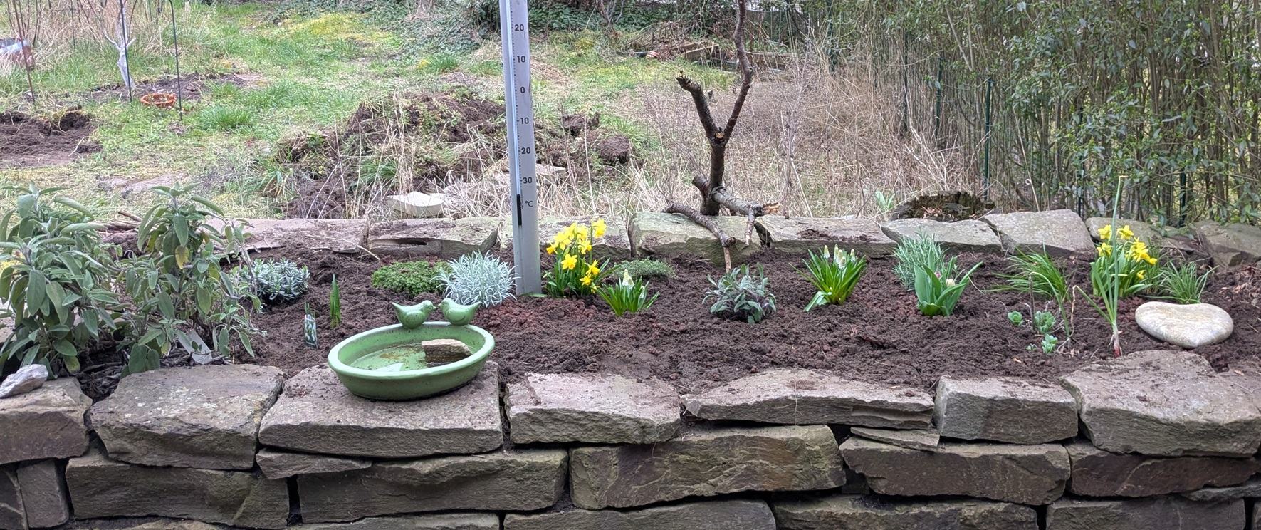 der Salbei bleibt erst mal, dann alles für wenig Wasser: Lavendel, eine andere Sorte (?) Currykraut, eine weitere Sorte Salbei und wieder ein Rosmarin. Dazwischen Thymian und Frühblüher, damit es nicht ganz so kahl ist. Und Schnittknoblauch, wobei es der eigentlich etwas feuchter mag als das restliche Zeugs. Ich habe noch etwas Lavagranulat unter die Erde gemischt, damit der Boden nicht zu schwer wird – wobei das die vorherigen Bewohner ja auch nicht gestört hat.